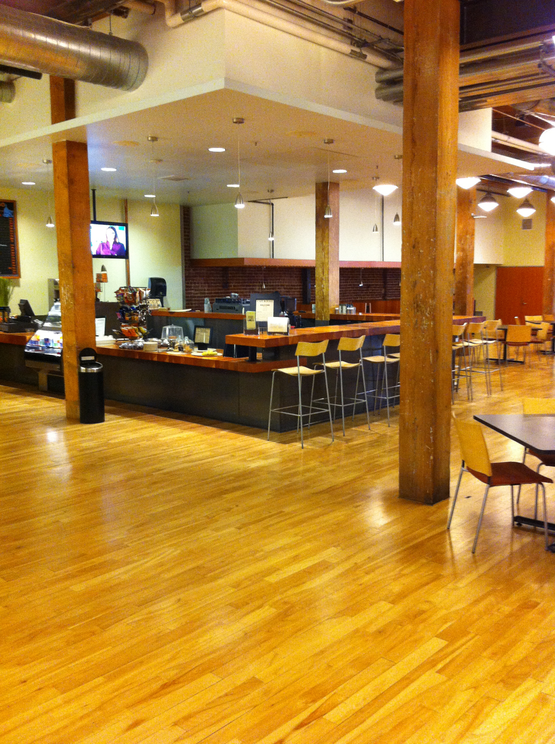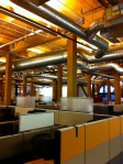 foto’s te zien is is het een bakstenen pand. Voor ons niets bijzonders, hier in de VS zie je dat echter niet vaak. Van binnen allemaal ruw afgewerkt hout, met veel industriële elementen. Een zeer grote koffiecorner en een groot restaurant maken het helemaal af. Vanuit een ooghoek zag ik ook nog ergens wasmachines staan. Bedrijven in de VS hebben al lang geleden bedacht dat het, vanuit het oogpunt van productiviteit, handig is als mensen op kantoor hun kleren kunnen laten wassen. Hoe minder ze thuis hoeven te doen, hoe meer ze op kantoor zijn…