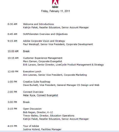 Tijdens de lunch hebben we gesproken met Ann Lewness, zij is wereldwijd verantwoordelijk voor de marketing van alle Adobe producten. Aan haar hebben we aangegeven wat wij denken dat Adobe in Nederland zou moeten doen om het onderwijs op de beste manier van informatie te voorzien. Ze was duidelijk op de hoogte van wie we waren en stond open voor veel van onze ideeën.