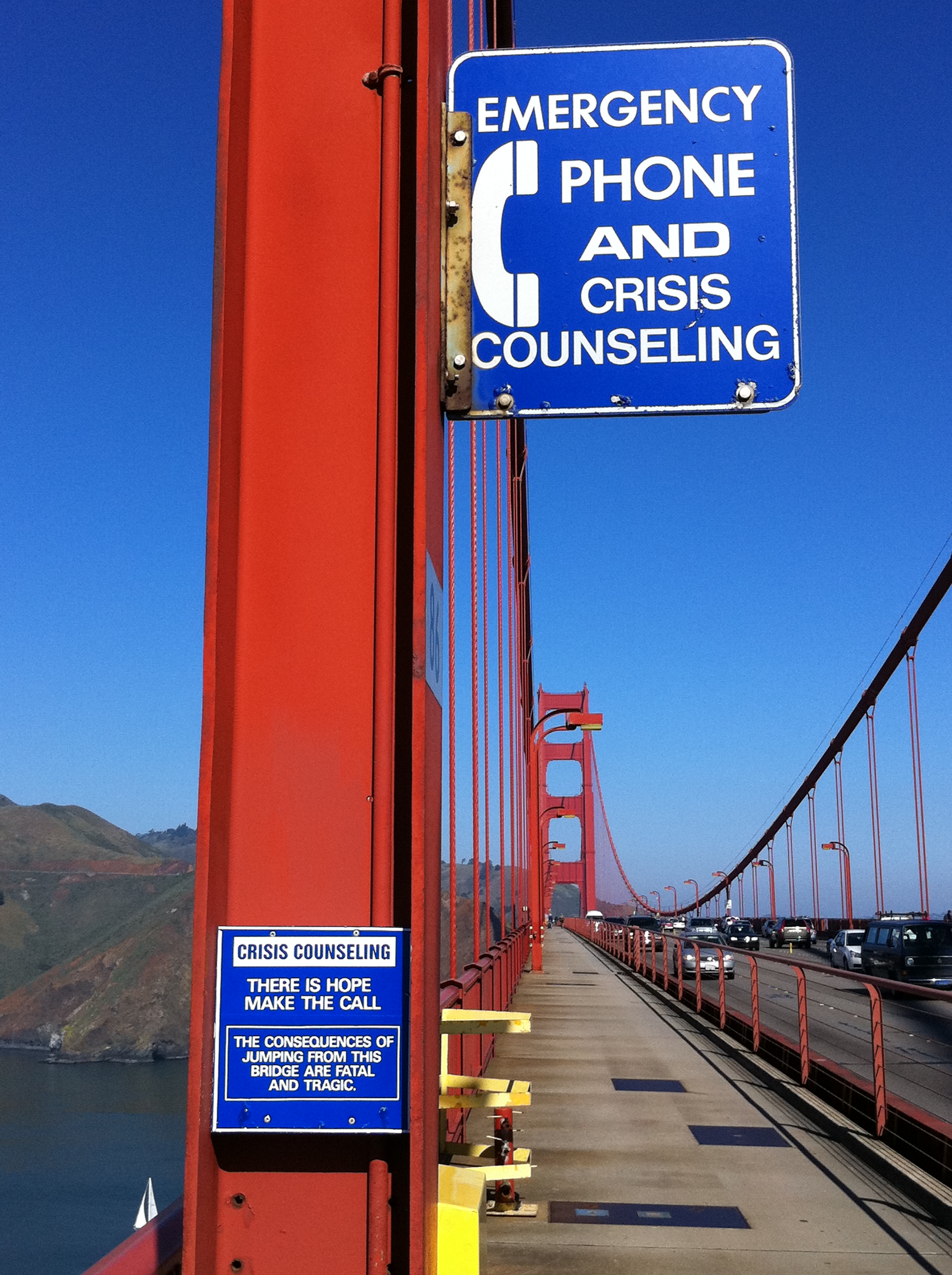 Het fietsen over de brug was super. Het uitzicht is fantastisch. Tegelijkertijd valt op dat er helemaal geen hoog hek is. Gemiddeld plegen er dan ook 2 mensen per maand zelfmoord op deze plek. Er staan op verschillende plekken borden waarmee ze proberen de springers tegen te houden. Geen idee of dat werkt.