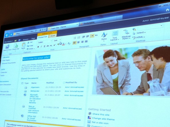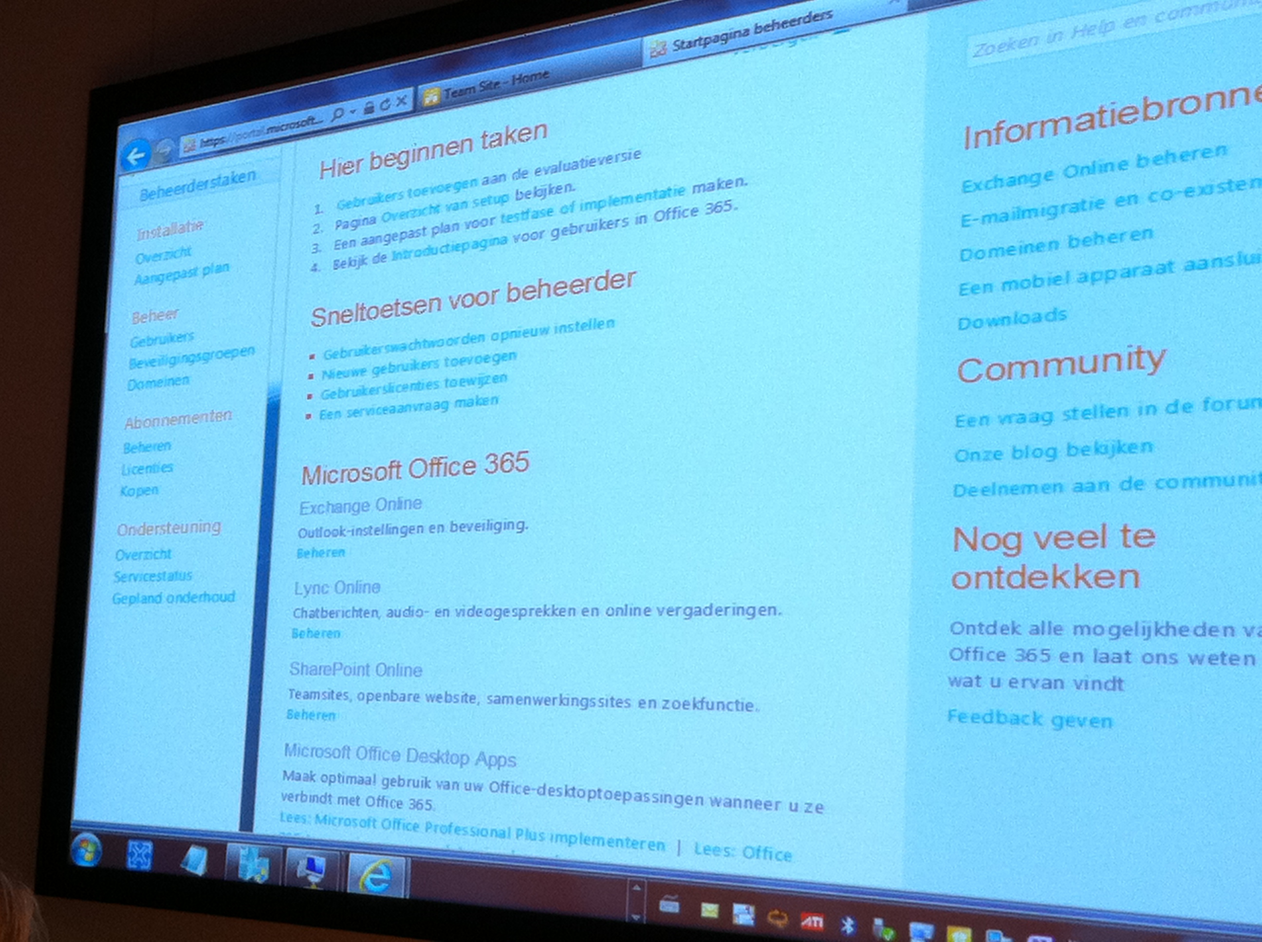 Ik heb al veel presentaties over Office 365 gezien, maar tot nu toe bleef het steeds bij slides. Nu kregen we opeens een live demo van de Nederlandstalige Beta en ik moet zeggen ik was erg onder de indruk. Dermate onder de indruk dat het me goed leek wat op te schrijven over deze dienst van Microsoft die, afgaande op de reacties uit de zaal, ook in het onderwijs duidelijk “hot” is. Ik heb even wat rond gekeken op Internet en kon redelijk wat plaatjes over Office 365 vinden. Kortom, het is geen geheim meer. Hieronder zijn dan ook wat (soms onduidelijke) foto’s van de demo te zien. Een sneak preview dus 🙂