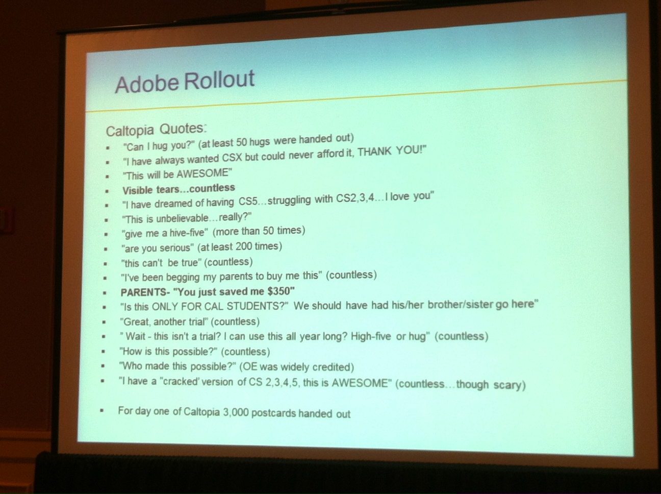 De dag begon met een introductie van Adobe. Eén van de Adobe presentatoren kwam met een interessante inleiding. Hij vertelde over dat hij in dienst gezeten had en uitgezonden was. Hij trok een strakke analogie tussen het leger en onderwijs: