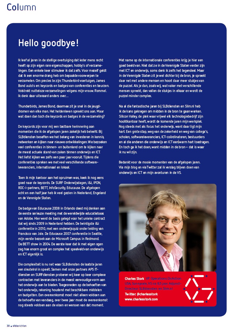 Voor mijzelf geldt dat ik na 8,5 fantastische jaren bij SLBdiensten en Slim de kans heb gekregen om midden in de bron te gaan werken. Silicon Valley, de plek waar vrijwel elk technologie bedrijf haar hoofdkantoor heeft, wordt de komende jaren mijn werkplek. Nog steeds met als focus het onderwijs, want daar ligt mijn hart. Een grote stap, weg van de zekerheid en weg van collega’s, scholen, softwareleveranciers, ict-coördinatoren, bestuurders en al die anderen die onderwijs en ict een warm hart toedragen. En toch ga ik het doen, midden in de bron is waar ik nu wil zijn.